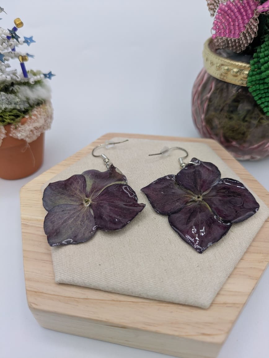 boucle d'oreille fleur d'hortensia séchée et résinée , crochet en acier inoxydable